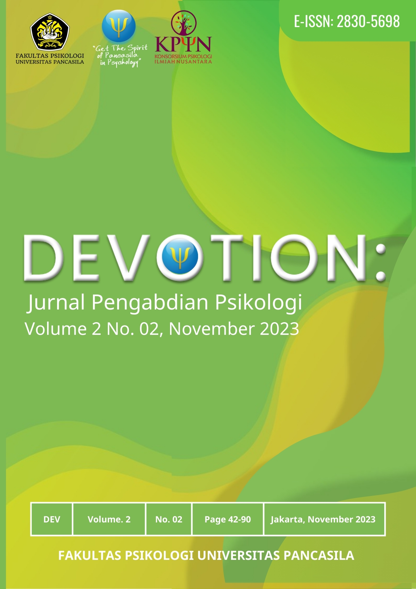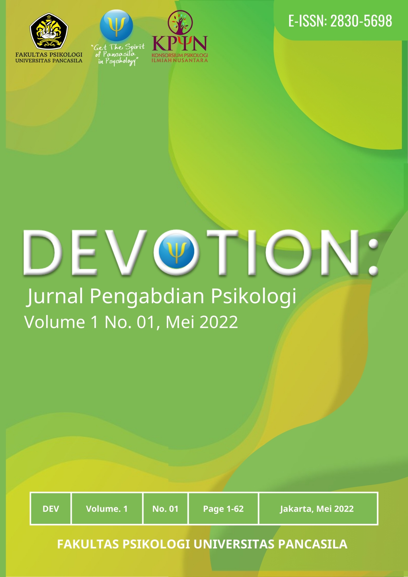 Devotion: Jurnal Pengabdian Psikologi (ISSN: 2830-5698) is a scholarly community service journal published by the Faculty of Psychology, Universitas Pancasila, dedicated to disseminating practical applications of psychological knowledge to serve communities.